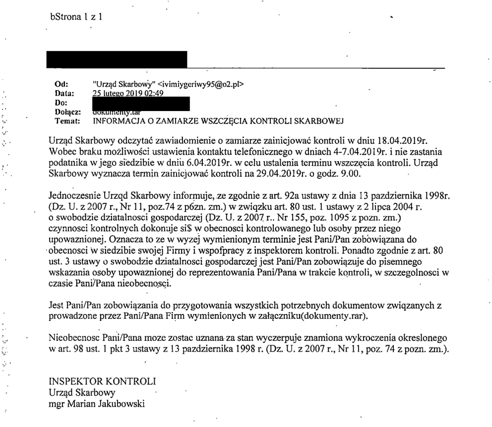 Ostrzegamy przed fałszywymi wiadomościami e-mail informującymi o „zamiarze wszczęcia kontroli skarbowej”, których odbiorca proszony jest o przygotowanie dokumentów wymienionych rzekomo w pliku dołączonym do wiadomości.