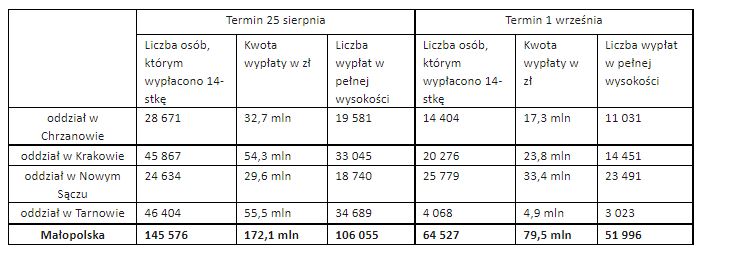 Zakład Ubezpieczeń Społecznych rozpoczął wypłatę „czternastek” 25 sierpnia. W Małopolsce przelew z dodatkowym świadczeniem pieniężnym otrzymało wtedy prawie 145,6 tys. osób, z czego 106 tys. w pełnej wysokości, czyli 1338,44 zł brutto. Łączna kwota przekazanych środków to 172,1 mln zł.