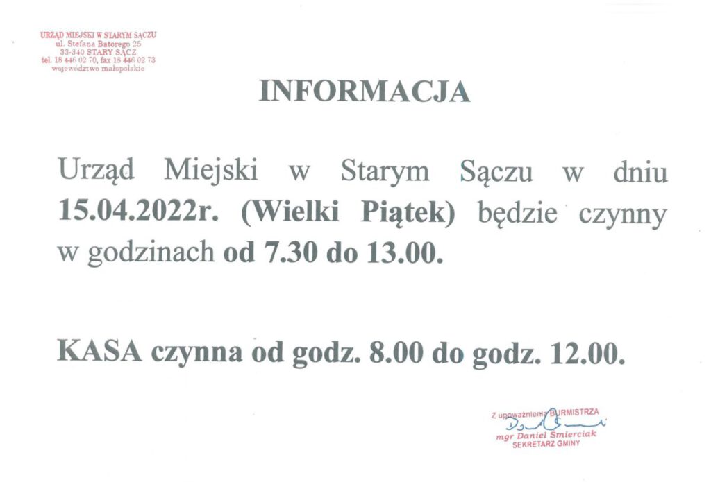 W Wielki Piątek urząd miejski czynny do g. 13.00