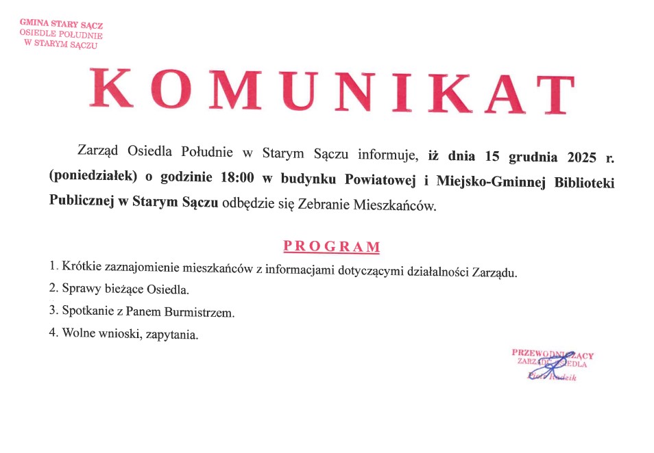 Zarząd Osiedla Południe zaprasza mieszkańców na spotkanie