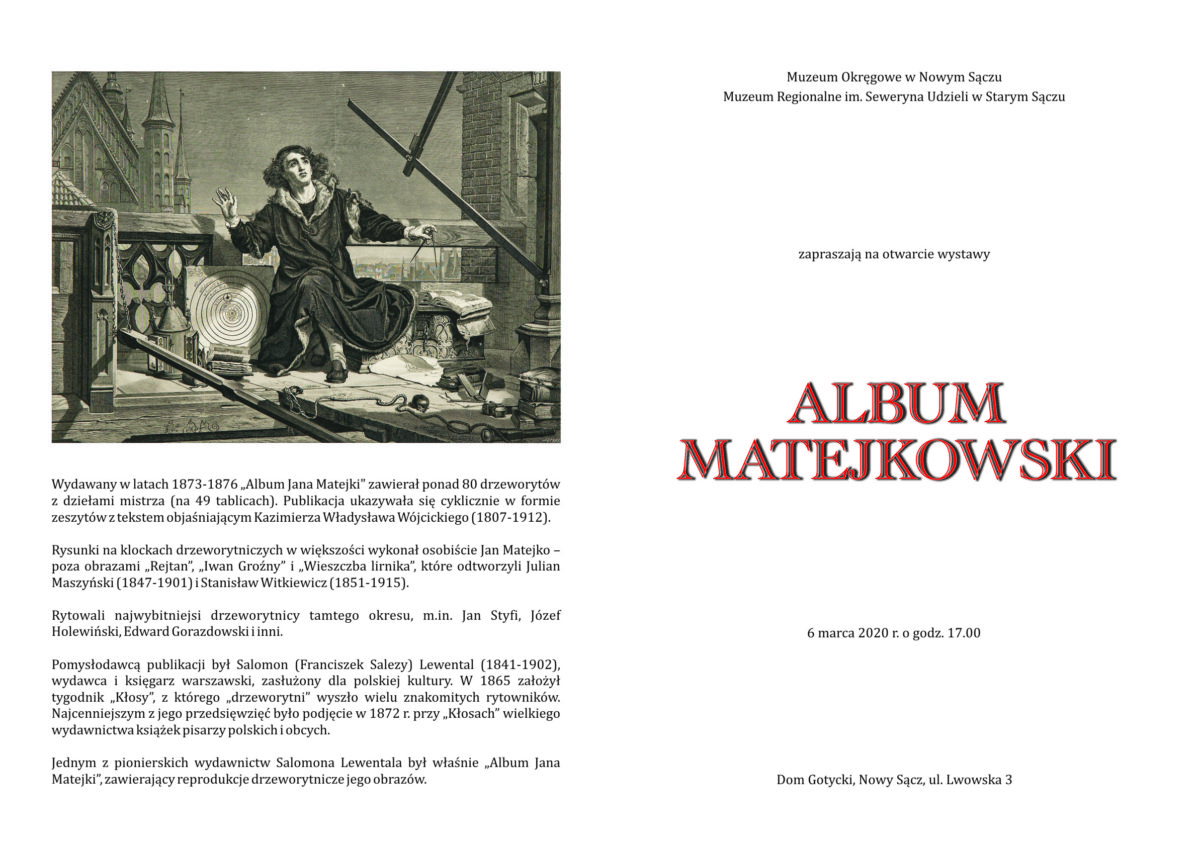 Muzeum Okręgowe w Nowym Sączu wraz z Muzeum Regionalnym w Starym Sączu serdecznie zapraszają na wernisaż wystawy „Album Matejkowski”, który odbędzie się w dniu 6 marca 2020 r. /piątek/ o godz.: 17.00 w Domu Gotyckim w Nowym Sączu.
