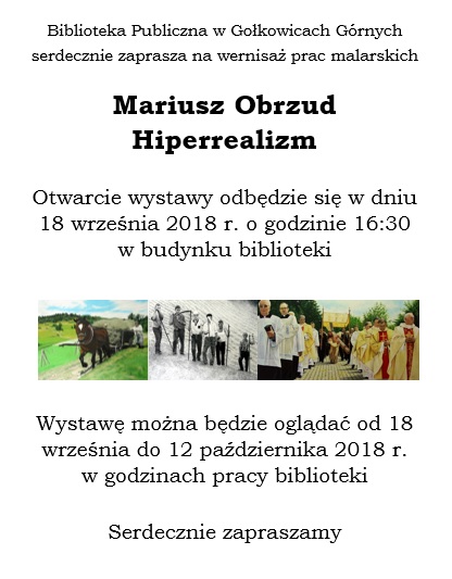 18 września o godzinie 16:30 w Bibliotece w Gołkowicach Górnych odbędzie się wernisaż prac Mariusza Obrzuda.