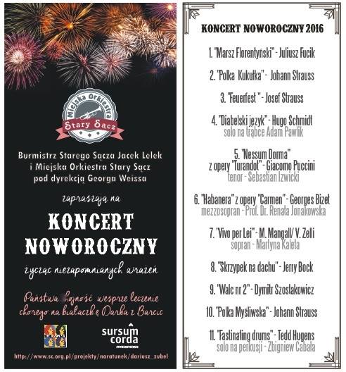 Miejska Orkiestra Stary Sącz pod dyrekcja Georga Weissa zaprezentuje się w specjalnym programie wiedeńskim (m.in. Johann Stauss ojciec i syn, Julius Fucik) oraz wiązanek arii (G. Bizet, G. Puccini, J. Bock, A. Bocelli) z udziałem solistów: Renata Jonakowska-Olszowska (mezzosopran), Jakub Łęczycki (baryton), Sebastian Iźwicki (tenor), Martyna Kaleta (sopran), oraz solistów instrumentalistów: Zbigniew Cabała (perkusja), Adam Pawlik (trąbka), Walerian Kurek (ksylofon)