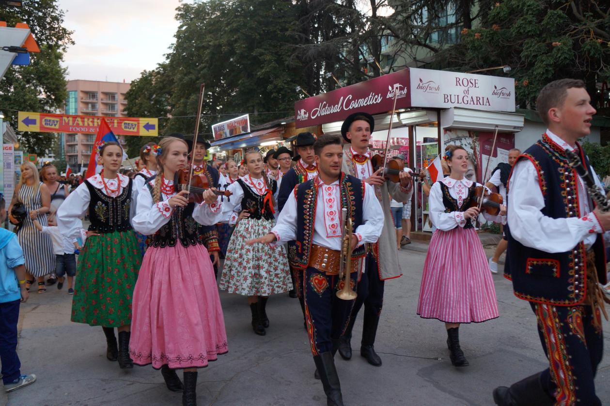 Występy były połączone z uroczystym przemarszem zespołów przez miasto, które trwało ok. 30 min. Raz po raz słyszeliśmy głośne brawa i podziękowania za przyjazd na festiwal od wielu rodaków spędzających tam wakacje. Tancerze „wyrywani” byli do wspólnych zdjęć fotograficznych z naszymi rodakami, i nie tylko, gdyż kunszt ubioru, stroju regionalnego wzbudzał ogromny zachwyt i aplauz, nie wspominając o śpiewie i muzyce wykonywanej podczas przemarszów . Po dotarciu do amfiteatru, rozpoczynały się festiwalowe prezentacje. Artyści z różnych stron Europy prezentowali swoje programy, a jurorzy skrupulatnie oceniali wykonanie i program koncertu danego zespołu.