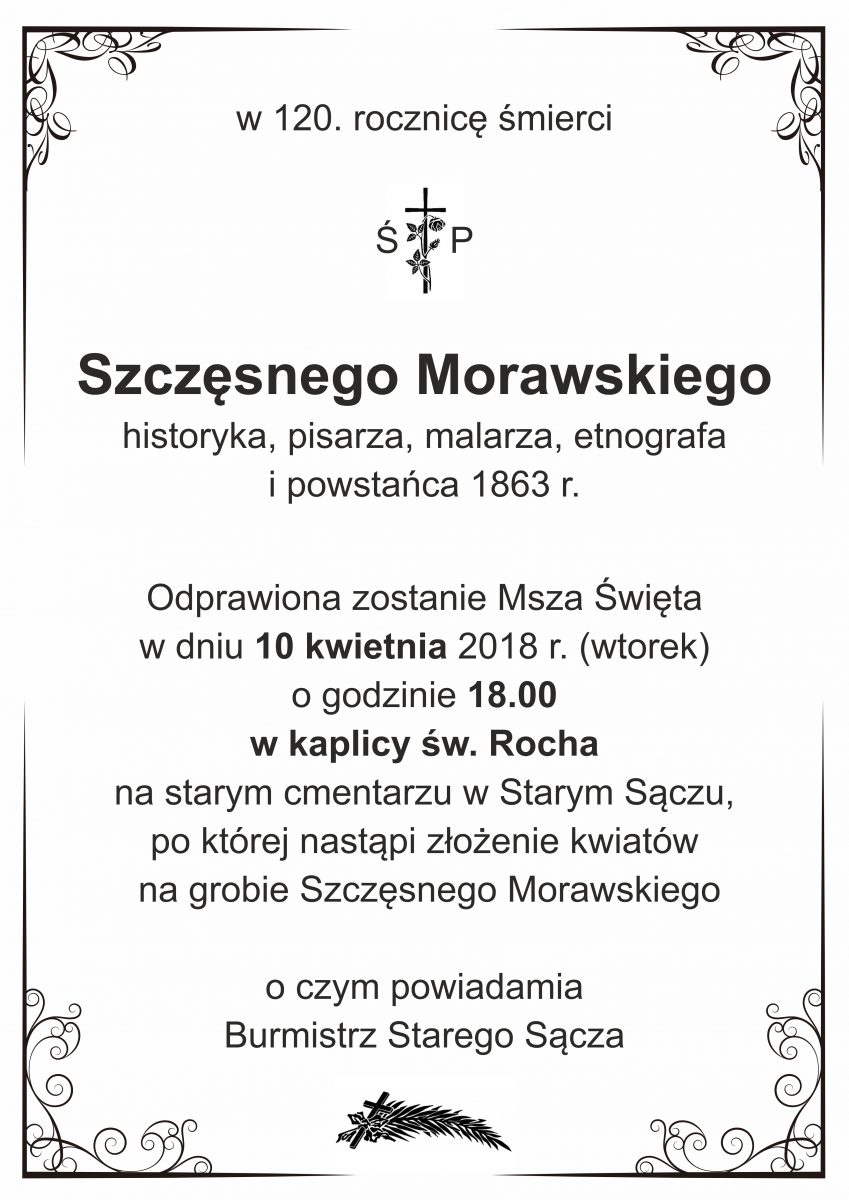 W roku 2018 przypadają trzy ważne rocznice związane z losami wielce zasłużonego dla badań dziejów Sądecczyzny polskiego historyka, pisarza, malarza i etnografa – pierwszego piewcy i „odkrywcy” Ziemi Sądeckiej – Feliksa Jana Szczęsnego Morawskiego: 200. rocznica jego urodzin w Rzeszowie, 120. rocznica śmierci w Starym Sączu oraz 155. rocznica wydania fundamentalnego dzieła „Sądecczyzna.