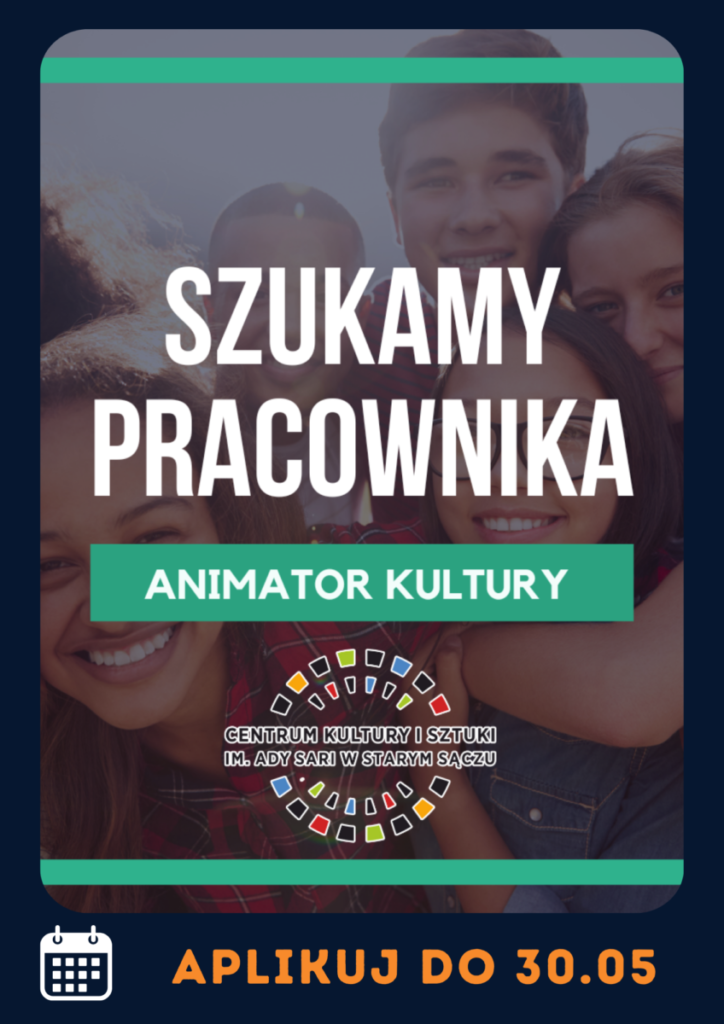 Centrum Kultury i Sztuki im. Ady Sari w Starym Sączu – aktywna instytucja kultury, znana z ciekawych i wartościowych przedsięwzięć realizowanych w regionie sądeckim – ogłasza nabór na stanowisko Animatorki/Animatora Kultury, z ukierunkowaniem na pracę z młodymi ludźmi.