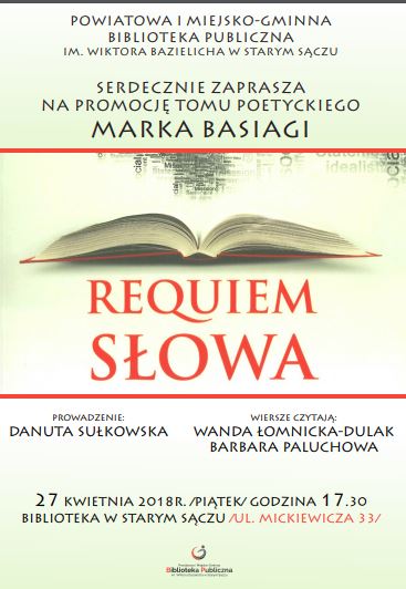 Już dzisiaj (27 kwietnia) o godzinie 17:00 w Powiatowej i Miejsko-Gminnej Bibliotece Publicznej w Starym Sączu, przy ulicy Mickiewicza 33 odbędzie się promocja tomu poetyckiego Marka Basiagi.