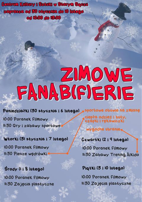 Jak co roku Centrum Kultury i Sztuki w Starym Sączu zorganizowało dzieciom Zimowe FANA(B)FERIE. Zajęcia rozpoczynają się o godzinie 10:00 w Kinie Sokół od filmowej niespodzianki. Potem są zabawy w terenie: gry sportowe, piesze wędrówki, trening Aikido, zajęcia plastyczne czy ślizg z Góry Miejskiej na czym się da…zobaczcie sami!