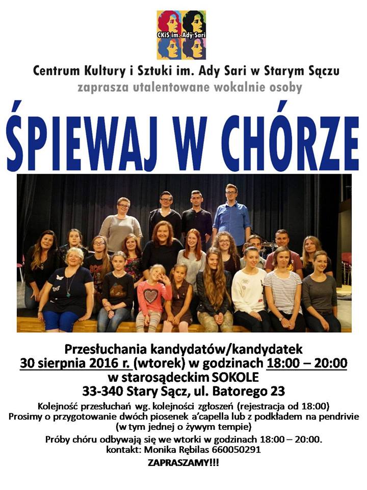 30 sierpnia (wtorek) od godziny 18:00-20:00 w Centrum Kultury i Sztuki im Ady Sari w Starym Sączu odbędą się przesłuchania do Chóru Gospel i Muzyki Rozrywkowej w Starym Sączu. Dołącz do zespołu i ciesz się ze wspólnego muzykowania. Zajęcia są bezpłatne i odbywają się w każdy wtorek.