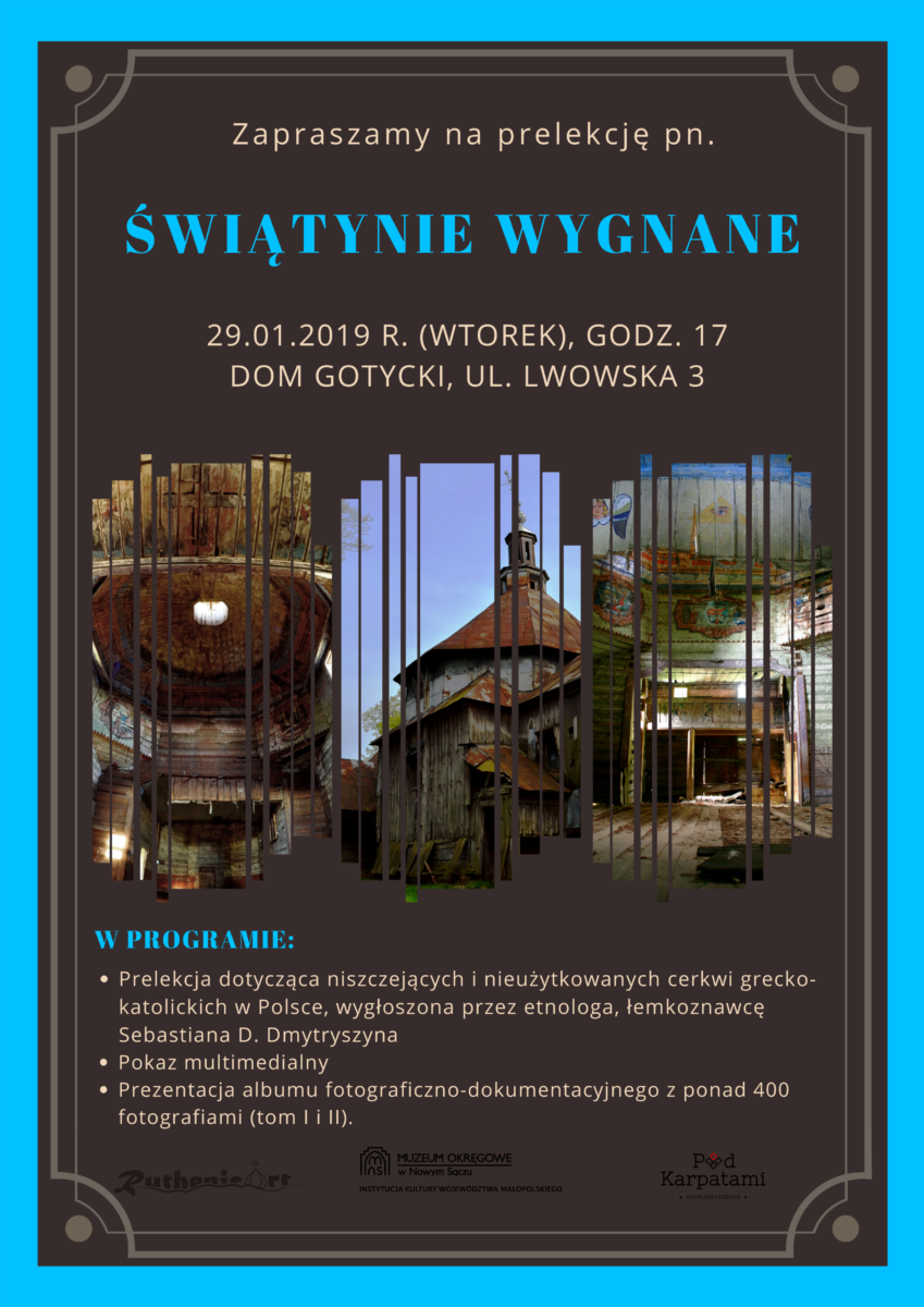 Muzeum Okręgowe w Nowym Sączu posiada cenną kolekcję ikon, prezentowanych w „Domu Gotyckim”, pochodzących z terenów Zachodniej Łemkowszczyzny. W ramach promocji tego zbioru i przypomnienia dziejów Łemków zapraszamy wraz ze Stowarzyszeniem „Pod Karpatami” na prelekcję pn. „Świątynie wygnane”, w ramach której odbędzie się wykład i prezentacja multimedialna. Wykład dotyczący niszczejących i nieużytkowanych cerkwi greckokatolickich w Polsce wygłosi etnolog, łemkoznawca Sebastian D. Dmytryszyn w oparciu o fotografie z dwutomowego albumu, poświęconego tej tematyce. Publikacja została zrealizowana przez Oficynę Wydawniczą RuthenicArt, zdjęcia do albumu wykonał podróżnik i fotograf Piotr Durak, który napisał też do nich odautorskie komentarze, zaś całość została poprzedzona tekstami m.in. dr Moniki Rzepiejewskiej i dr. Wasyla Słobodiana. Na publikację pt. „Świątynie wygnane. Niszczejące cerkwie greckokatolickie w Polsce” składają się:  Tom 1 (242 s.) – cerkwie znajdujące się w miejscowościach od A do M i Tom 2 (232 s.) –  cerkwie znajdujące się w miejscowościach od N do Ż. To pierwszy i jedyny album fotograficzno-dokumentacyjny ukazujący wnętrza wszystkich odnalezionych „opuszczonych” cerkwi greckokatolickich na terenie całej Polski. Dwa tomy to około 80 miejscowości i przeszło 400 unikatowych dokumentalno-artystycznych fotografii; często są to jedyne fotografie prezentujące wnętrza tych świątyń. Praca nad zebraniem,  a następnie przygotowaniem materiałów trwała siedem lat – to przejechanych kilkanaście tysięcy kilometrów śladami niszczejących cerkwi i wykonane setki zdjęć, by zarejestrować zmieniający się stan obiektów oraz oddać szczególną atmosferę „świątyń wygnanych”.
