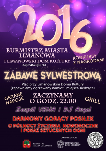 Burmistrz Miasta Limanowa i Limanowski Dom Kultury zapraszają do zabawy podczas Sylwestra pod Limanowskim Domem Kultury. Konkursy z nagrodami, grill, gorące napoje, muzyka i przede wszystkim dobra zabawa – to wszystko czeka na każdego kto 31 grudnia pojawi się na placu przy Limanowskim Domu Kultury.
