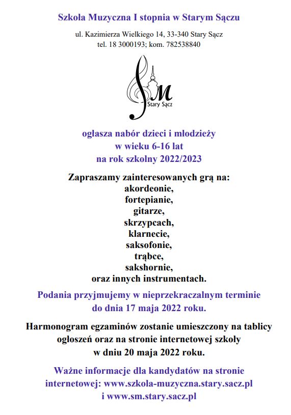 Szkoła Muzyczna I stopnia w Starym Sączu rusza z rekrutacją!