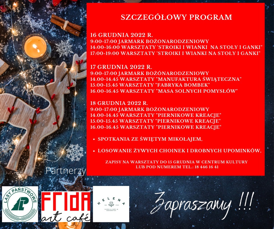 Dodatkowo podczas Jarmarku odbędzie się losowanie żywych choinek przekazanych przez Nadleśnictwo Stary Sącz, drobnych upominków oraz spotkanie ze Świętym Mikołajem. Klimatu dodadzą koksowniki przy których będzie można się ogrzać podczas zwiedzania Jarmarku.