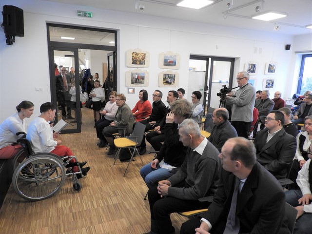 Po przywitaniu przybyłych gości przez p. dyrektor biblioteki – Marię Sosin, podopieczna Katarzyna Kłak wyrecytowała wiesz poetki p. Marty Dąbrowskiej pt. „Polecenie”. Następnie opiekun grupy fotograficznej przedstawił krótkie wprowadzenie w tematykę wernisażu. Podczas spotkania zaprezentowano również zdjęcie oraz film, które brały udział w konkursie pt. „Niepodległa bez barier od morza aż do Tatr” organizowanym przez PFRON.