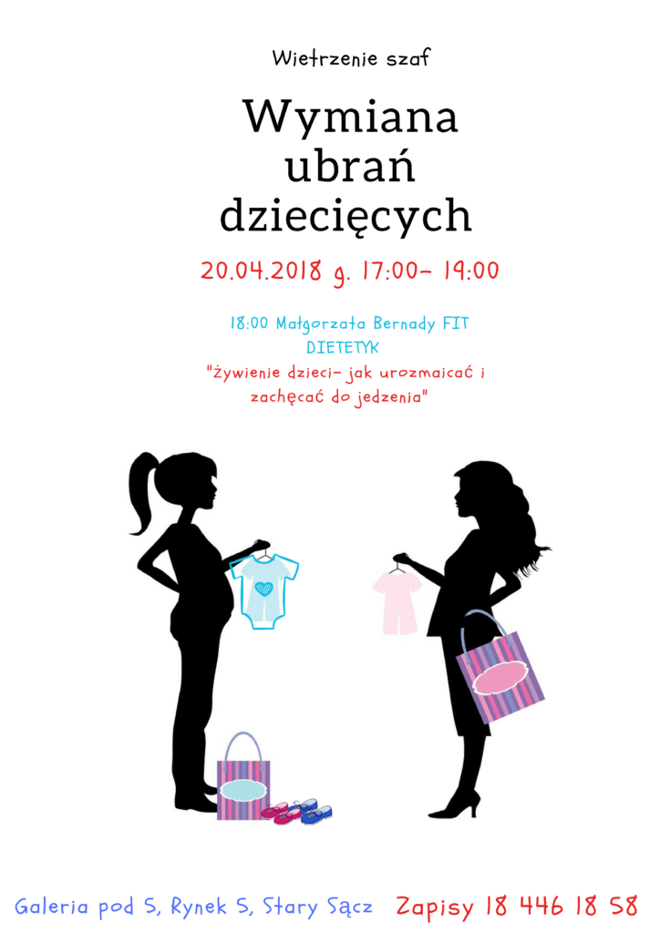 20.04.2018 zapraszamy wszystkie mamy -tatusiowie oczywiście też są mile widziani -na WIELKĄ WYMIANĘ UBRAŃ DZIECIĘCYCH. Zaczynamy o 17:00 -mówi Ewelina Wiśniewska z Galerii pod Piątką –Godzinę później gość specjalny Małgorzata Bernady Fit Dietetyk opowie o żywieniu dzieci.