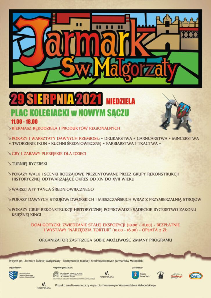 Stowarzyszenie Sądeckie Rycerstwo Zakonu Świętej Kingi oraz Muzeum Okręgowe w Nowym Sączu w niedzielę 29 sierpnia zapraszają na Jarmark Świętej Małgorzaty.