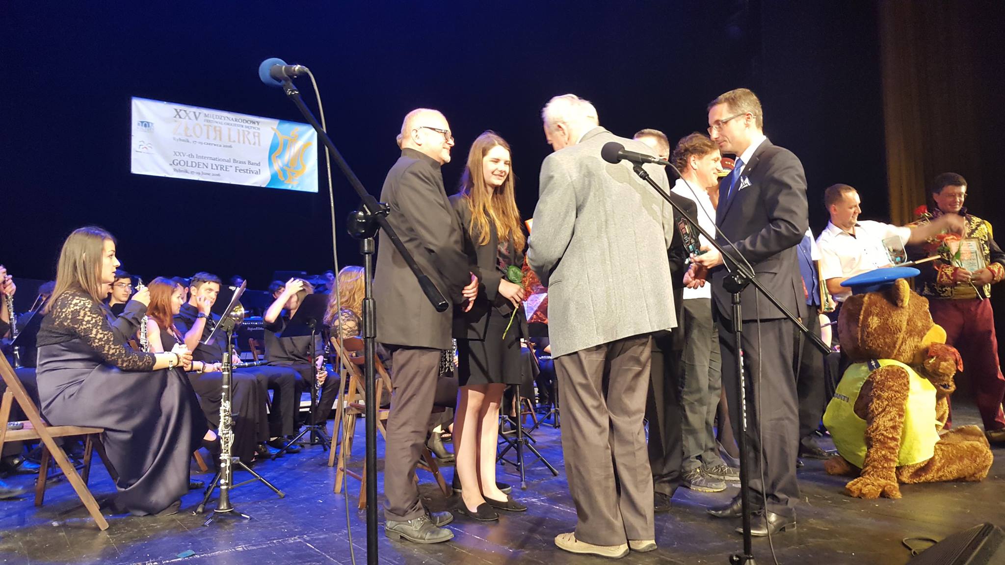 W Imieniu Orkiestry, Złote Pasmo podczas uroczystej gali odebrali Dyrektor Centrum Kultury i Sztuki im. Ady Sari w Starym Sączu Wojciech Knapik i jedna z najmłodszych członkiń orkiestry Ula Majda.