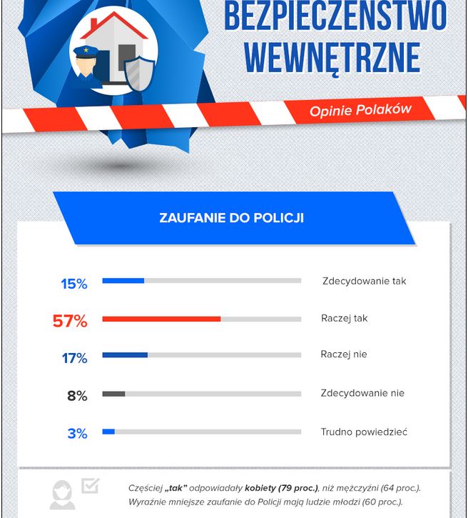 Na jego podstawie wywnioskowano iż Policja cieszy się zaufaniem Polaków. Większość respondentów (72 proc.) zadeklarowała, że zdecydowanie lub raczej ufa tej instytucji. Częściej taką deklarację składają kobiety (79 proc.), niż mężczyźni (64 proc.). Wyraźnie mniejsze zaufanie do Policji mają ludzie młodzi (60 proc.).