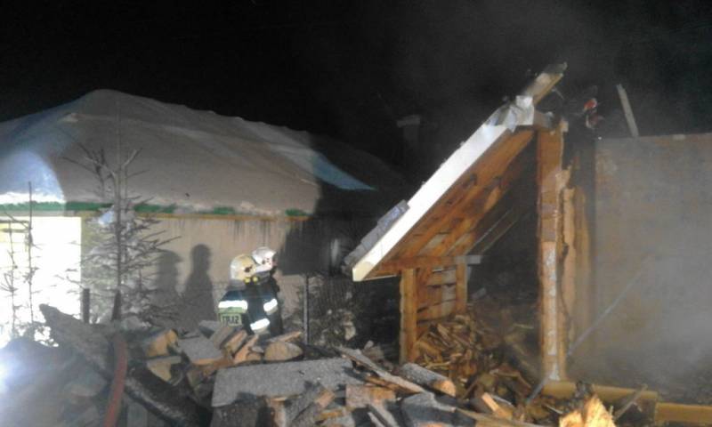 – Dojazd na miejsce był utrudniony przez zalegającą na drodze pokrywę śnieżną oraz trudne warunki terenowe. Po przybyciu na miejsce zdarzenia ustalono, że pożarem objęty był budynek gospodarczy z garażem o konstrukcji drewnianej. Płomienie wydostawały się na zewnątrz budynku. Przy budynku znajdował się skład drewna, a w bliskim sąsiedztwie palącego się budynku znajdował się garaż oraz dom mieszkalny. Obydwa obiekty były zagrożone przez wysoką temperaturę oraz płomienie – relacjonują strażacy –W pobliżu miejsca zdarzenia nie było hydrantów oraz punktów czerpania wody. Właściciele podjęli próbę ugaszenia pożaru przy pomocy węży ogrodowych (….) Spalone elementy budynku rozbierano oraz przelewano w celu dogaszenia. Podczas działań ratowniczo-gaśniczych strażacy pracowali w aparatach ochrony dróg oddechowych.