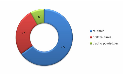 Wyniki badania wskazują, że obecnie 65% ankietowanych deklaruje zaufanie do Policji, natomiast 27% takiego zaufania nie ma. W porównaniu do wyników poprzedniego badania zaufania w sferze publicznej ze stycznia 2012, wyniki te nie uległy zmianie (spadek o 1 p.p. deklaracji braku zaufania do Policji). Wykres nr 1