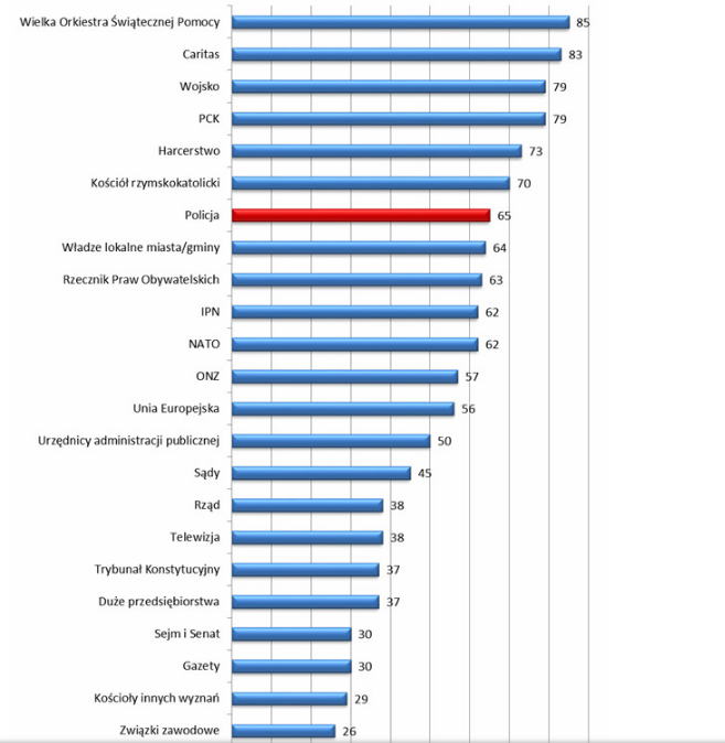 Z najnowszej edycji badania wynika, że większość Polaków ufa Policji jako instytucji. Większym uznaniem spośród instytucji państwowych cieszy się jedynie Wojsko. Dużo mniejszym zaufaniem Polacy darzą Sądy (45%) i Trybunał Konstytucyjny (37%).