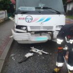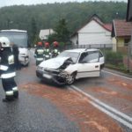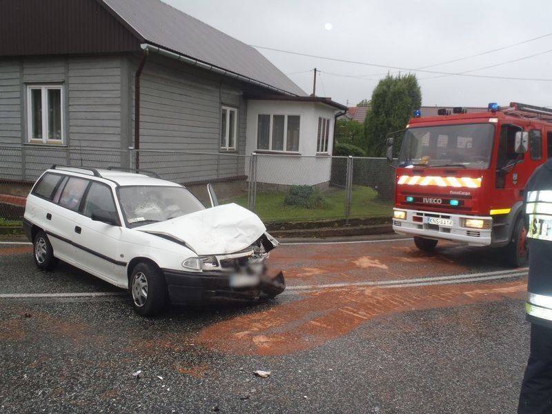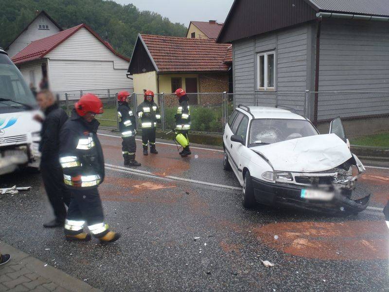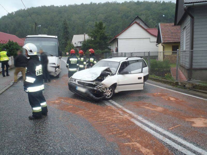 Z nieoficjalnych informacji wynika, że Opel wpadł w poślizg i czołowo zderzył się z prawidłowo jadącym busem. W osobówce „wystrzeliły” obie poduszki, ale pasażer doznał urazu głowy uderzając w przednią szybę. Przez osoby postronne został zabrany do domu pobliskiej posesji.