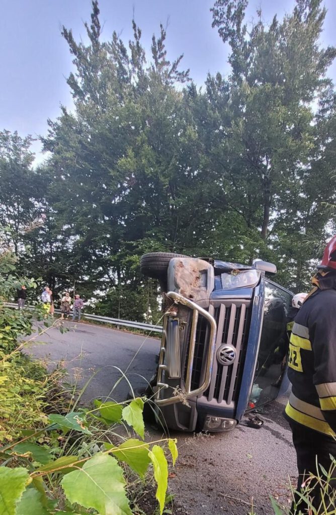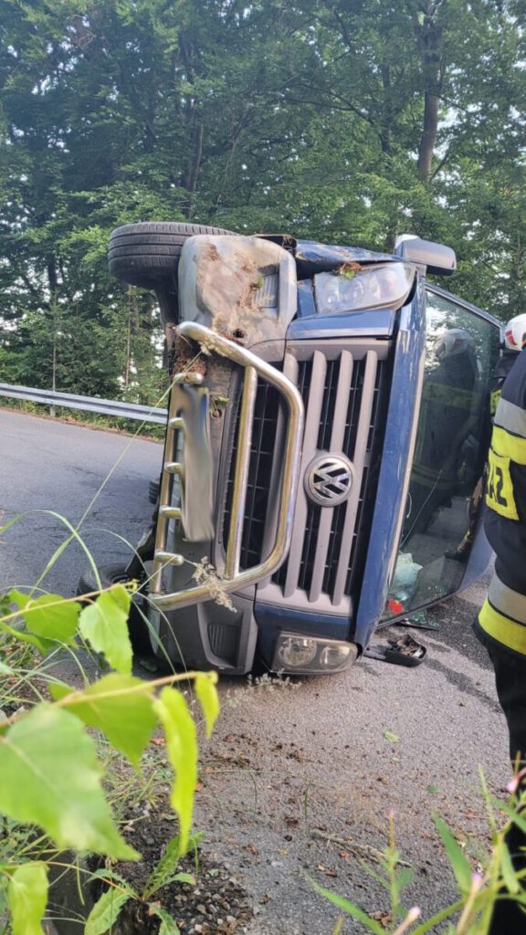 -Po przybyciu na miejsce zdarzenia ustalono, że samochód dostawczy – Volkswagen Crafter leżał na lewym boku na drodze blokując przejazd w obu kierunkach. Pojazdem podróżował sam kierowca –relacjonują strażacy –Kierujący pojazdem znajdował się w karetce Pogotowia Ratunkowego. Został przetransportowany do szpitala. Po zakończonych działaniach przez Policję pojazd postawiono na koła. Samochód został zabezpieczony na poboczu.
