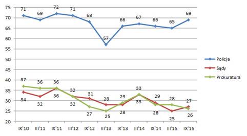 Wykres nr 4. Jak by Pan(i) ocenił(a) działalność Policji, sądów i prokuratury? (dobre oceny od IX 2010 do IX 2015) (%)