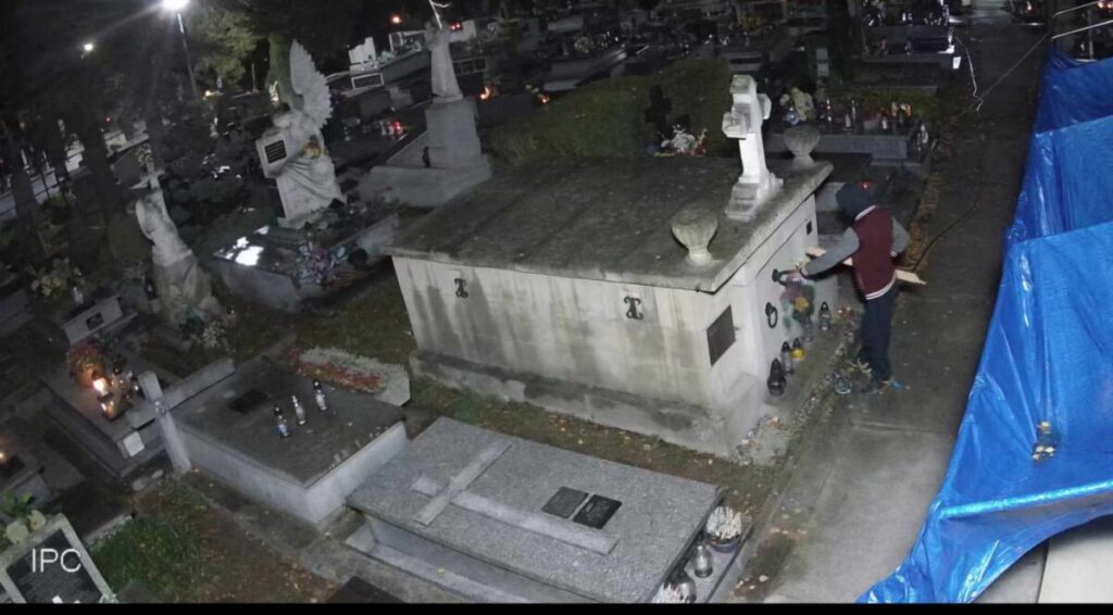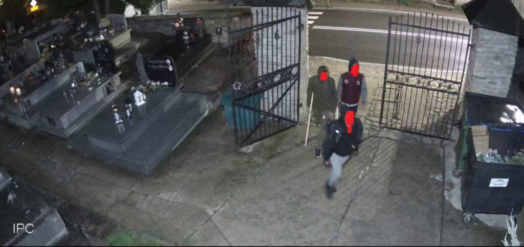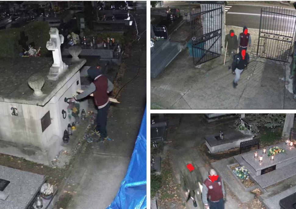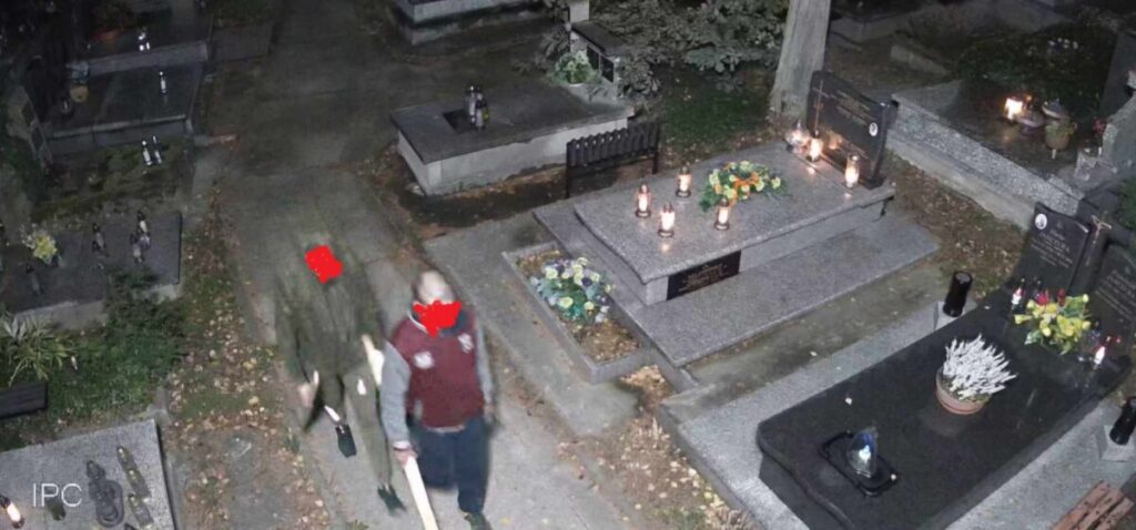 Monitoring zarejestrował kradzież i dewastację co najmniej 10 nagrobków w dniu 25.09.2024 (pomiędzy godz. 20 a 21) przez trzech sprawców.