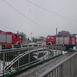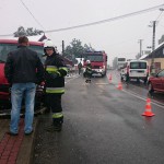 Kierowca samochodu dostawczego znajduje się w karetce Pogotowia Ratunkowego. Na miejscu pracują 3 zastępy Straży Pożarnej i Policja.