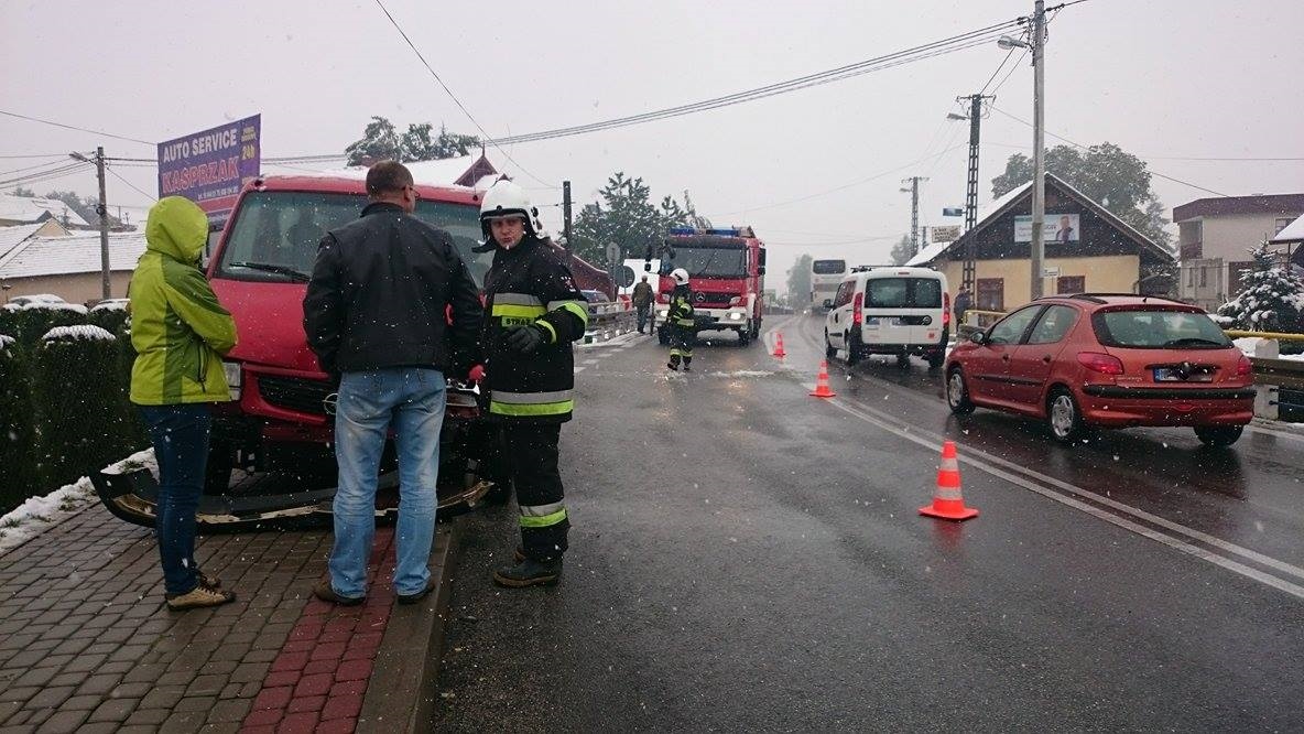 Kierowca samochodu dostawczego znajduje się w karetce Pogotowia Ratunkowego. Na miejscu pracują 3 zastępy Straży Pożarnej i Policja.