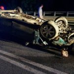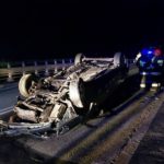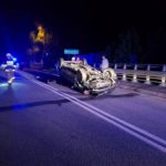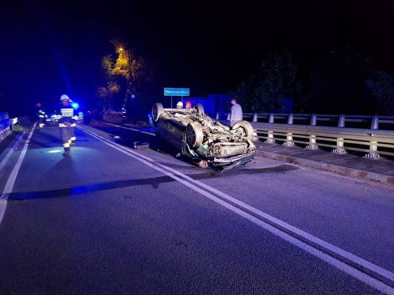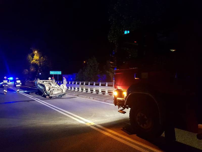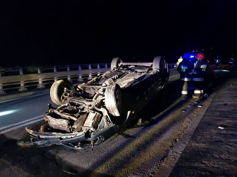 -Samochód osobowy marki Audi A6 znajdował się na dachu blokując jeden pas jezdni -relacjonują strażacy – Policja na czas prowadzonych działań blokowała drogę całkowicie. Z relacji świadków wynikało, że pojazdem podróżował tylko kierujący, który wydostał się na zewnątrz pojazdu o własnych siłach i oddalił się w nieznanym kierunku, przed przybyciem służb ratunkowych. Na miejsce zdarzeń został zadysponowany zastęp wraz z psami ratowniczymi. Po przybyciu na miejsce zdarzenia przewodnicy udali się do funkcjonariuszy Policji w celu uzyskania informacji o rejonie poszukiwań. Ze względu na specyfikę zdarzenia funkcjonariusze wraz ze strażakami zdecydowali iż nie jest możliwe wykorzystanie psów ratowniczych do poszukiwań. Działania Straży polegały na zabezpieczeniu miejsca zdarzenia, przeszukaniu pojazdu oraz przyległego terenu pod względem osób poszkodowanych, odłączeniu klem od akumulatora oraz kierowaniu ruchem drogowym, który odbywał się wahadłowo. Postawiono pojazd na koła i zepchnięto go pobocze. Usunięto części samochodu z jezdni na pobocze oraz dokonano sorpcji płynów eksploatacyjnych. Działania strażaków trwały ponad dwie i pół godziny.