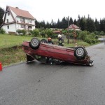 Samochód był na dachu i blokował przejazd w obu kierunkach. Postawiono pojazd na koła przy pomocy wyciągarki i usunięto go na pobocze drogi. Kierujący pojazdem został przebadany przez przybyłą załogę karetki Pogotowia ratunkowego i pozostał na miejscu zdarzenia. Objazd pojazdów na czas trwania działań odbywał się drogą boczną. Działania strażaków trwały półtora godziny.
