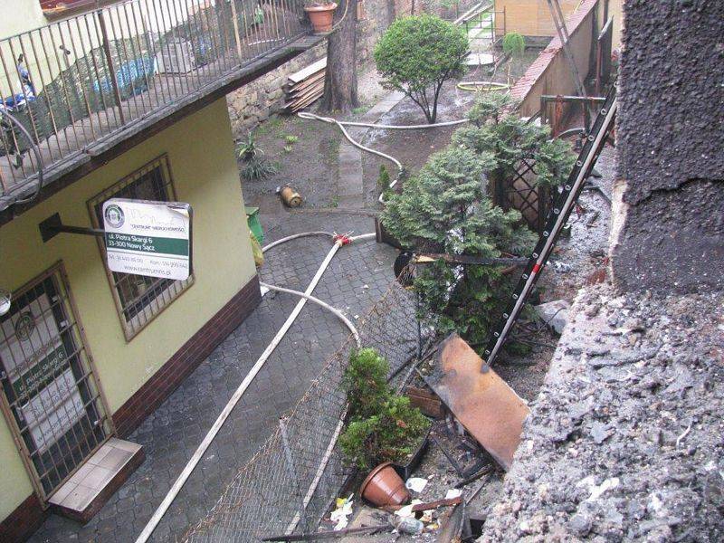 Jak relacjonuje Marian Marszałek z PSP Nowy Sącz –Na miejscu zdarzenia znajdował  się lokator, który przekazał informacje o mogących przebywać wewnątrz dwóch osobach.  Dodatkowe zagrożenie stanowiła  zwarta zabudowa oraz części wspólne dachu z innymi pobliskimi obiektami. W innych lokalach w obrębie budynku nie było osób. Działania strażaków polegały na  zabezpieczeniu  miejsca zdarzenia oraz wejściu przez strażaków do wnętrza mieszkania. Wejście do mieszkania było utrudnione ze względu na znacznie zaawansowany pożar.  W czasie prowadzenia działań na miejsce zdarzenia przybyła kobieta z której  relacji wynikało, iż  we wnętrzu nikogo już nie ma .W związku z tym dalsze działania polegały na  podaniu  jednego  prądu w obronie na sąsiednią kamienicę oraz  prowadzono działania gaśnicze wewnątrz mieszkania kolejno przeszukując pomieszczenia. Ugaszono palące się elementy wyposażenia mieszkania oraz  usunięto pozostałości po pożarze na dziedziniec, dodatkowo dogaszając tlące się pozostałości. Wprowadzono prąd gaśniczy na poddasze kamienicy dogaszając tlącą się konstrukcje dachu oraz materiały tam zgromadzone. Dokonano prac rozbiórkowych stropu oraz części pokrycia dachu wraz z więźbą dachową. Działania ratowniczo – gaśnicze prowadzone przez 9 zastępów i 34 strażaków PSP i OSP trwały prawie cztery godziny. Prawdopodobną przyczyną pożaru było zwarcie instalacji elektrycznej.