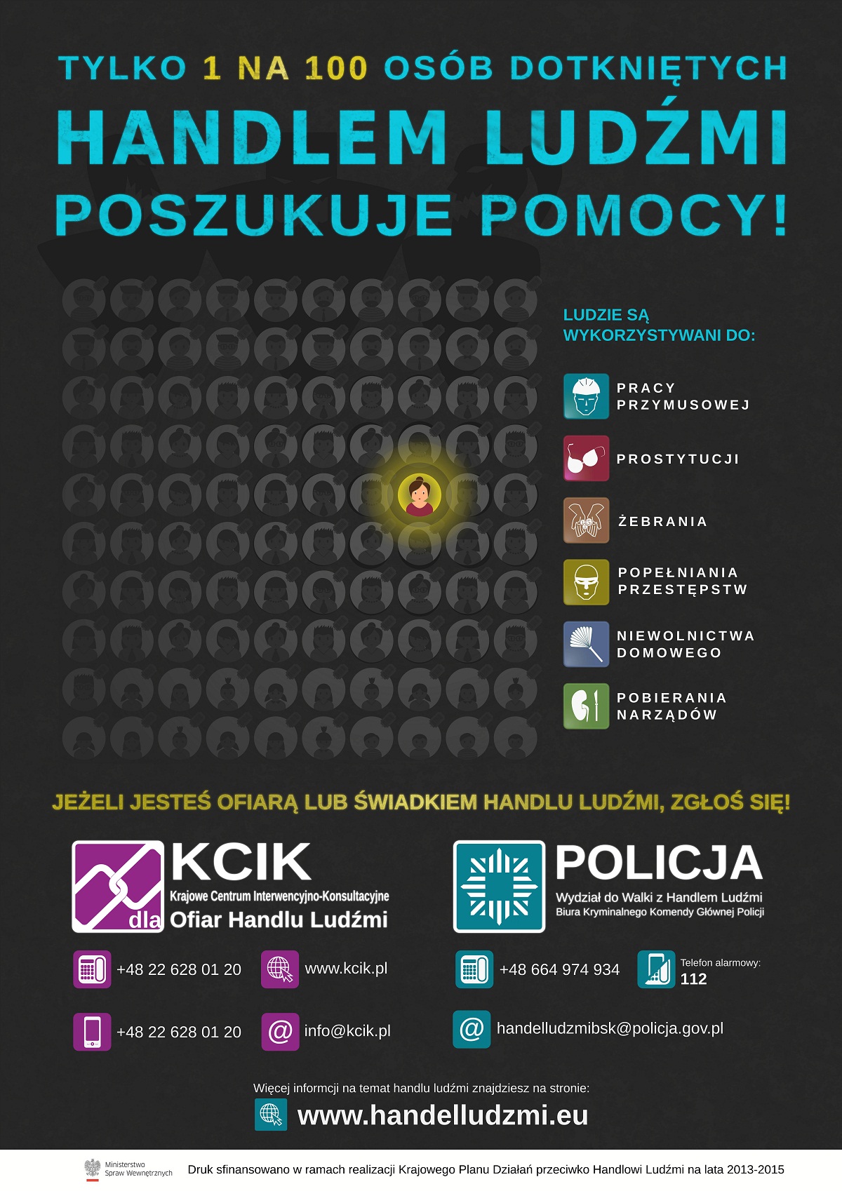 Te informacje znajdują się w poradniku, opracowanym przez MSW. Pamiętajmy, że każdy może stać się ofiarą handlu ludźmi. Policja w latach 2011-2014 odnotowała 750 takich przypadków. Wśród wszystkich form handlu ludźmi policja najczęściej notuje zmuszanie do prostytucji, pornografii i innych form wykorzystania seksualnego.