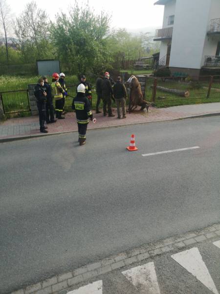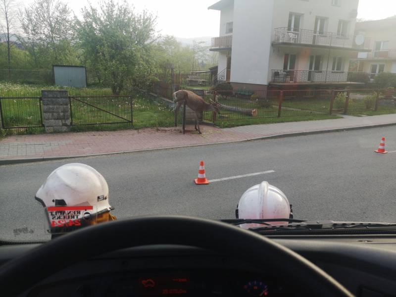 –Po przybyciu na miejsce zdarzenia ustalono, że na jednej z posesji znajdował się ranny jeleń uwięziony na bramie ogrodzeniowej -relacjonują strażacy –Na miejscu nie było właściciela działku. Była obecna Policja. Działania strażaków polegały na zabezpieczeniu miejsca zdarzenia. Nie było możliwości uwolnienia zwierzęcia ze względu na jego dużą ruchliwość, pobudzenie oraz agresywność. Policja poinformowała Nadleśnictwo Piwniczna Zdrój o zaistniałej sytuacji i o konieczności przyjazdu na miejsce leśniczego. Wyłączono jeden pas ruchu i kierowano ruchem drogowym, który odbywał się wahadłowo. Na miejsce dotarł leśniczy do spraw łowieckich. Niestety w trakcie działań zwierzę zdechło. Na prośbę leśniczego przy użyciu narzędzi hydraulicznych zsunięto bramę z zawiasów i uwolniono martwe zwierzę. Miejsce działań zmyto jednym prądem wody. Działania strażaków trwały półtorej godziny.