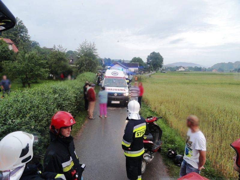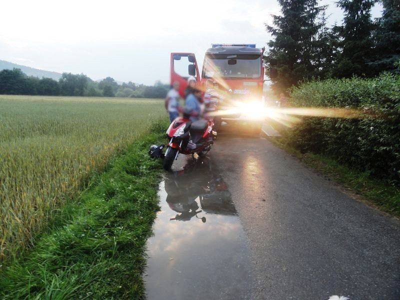Zdarzenie miało miejsce na wąskiej gminnej drodze. Na mokrej nawierzchni kierujący skuterem stracił równowagę i przewrócił jednoślad na asfaltową drogę. W chwili przybycia na miejsce pierwszego zastępu strażaków obecny był zespół Pogotowia Ratunkowego, który zajmował się obydwoma osobami jadącymi skuterem. Osoby zostały przetransportowane na dalsze badania do szpitala.
