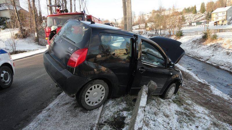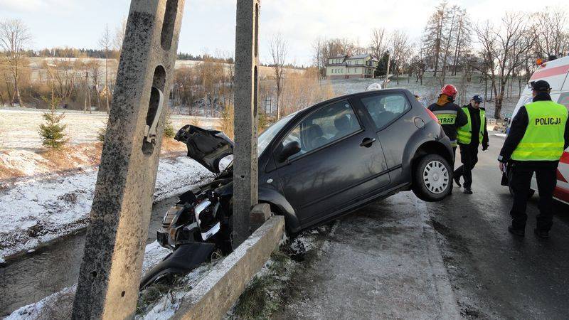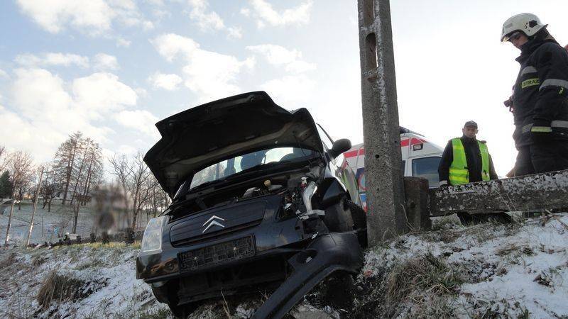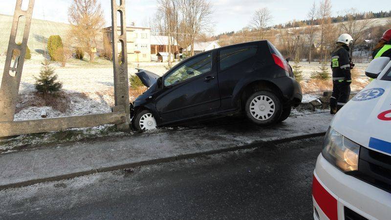 –około 6.45 w miejscowości Korzenna na drodze powiatowej kierująca pojazdem marki Citroen, na łuku drogi prawdopodobnie nie dostosowała prędkości do panujących warunków na drodze i na oblodzonej nawierzchni straciła panowanie nad pojazdem.W efekcie uderzyła w betonową barierę.Kierująca została przewieziona do szpitala na dalsze badania.