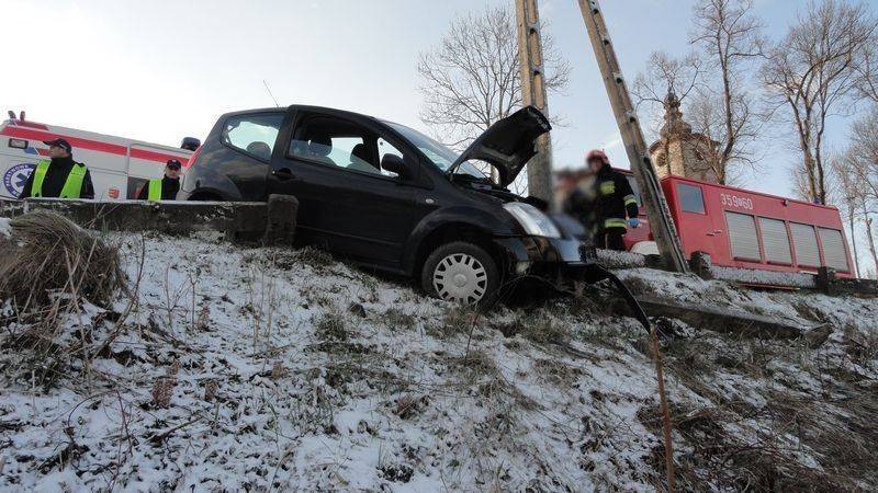 Po przybyciu na miejsce zdarzenia ustalono, że samochód osobowy zjechał z drogi i uderzył w betonowy słup. Samochód znajdował się poza drogą na skarpie nad korytem potoku. W samochodzie znajdowała się jedna osoba.