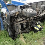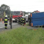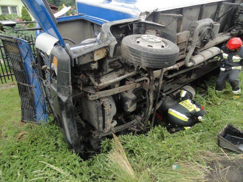 Kierujący samochodem ciężarowym najechał na tył samochodu osobowego. W wyniku uderzenia samochód osobowy pozostał na drodze blokując jeden pas ruchu a samochód ciężarowy zjechał z drogi i leżał na prawym boku w przydrożnym rowie. Nikt z podróżujących pojazdami nie odniósł obrażeń.