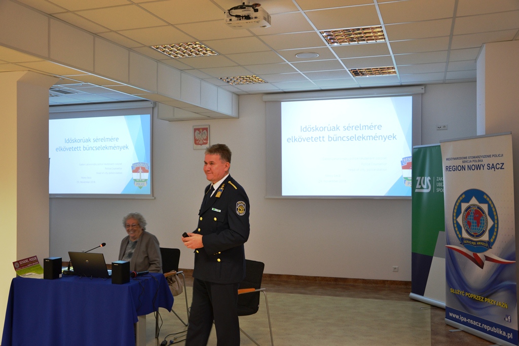 Uczestnicy konferencji wysłuchali czterech prelekcji. Podkom. Justyna Basiaga, specjalista Zespołu ds. Prewencji Kryminalnej, Nieletnich i Patologii Wydziału Prewencji KMP w Nowym Sączu, omówiła kwestię dotyczącą przestępstw popełnianych na szkodę seniorów oraz wskazała sposoby, jak im przeciwdziałać. Wśród prelegentów byli także przedstawiciele Policji ze Słowacji – kpt. Ing. Milan Ženčuch z Komendy Policji w Starej Ľubovni oraz Węgier – ppłk Gábor Latorovszky, Komendant Policji w Vac, którzy zaprezentowali rozwiązania i praktyki w zakresie bezpieczeństwa seniorów stosowane w ich krajach. Głos zabrała również Anna Mieczkowska, przedstawicielka Zakładu Ubezpieczeń Społecznych w Nowym Sączu, która wygłosiła wykład pt. „Bezpieczne pieniądze seniora”. Konferencję podsumowała współorganizatorka, Elżbieta Gargula, która podziękowała prelegentom i wszystkim zebranym za udział we wczorajszym wydarzeniu.