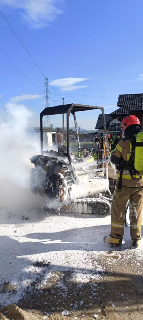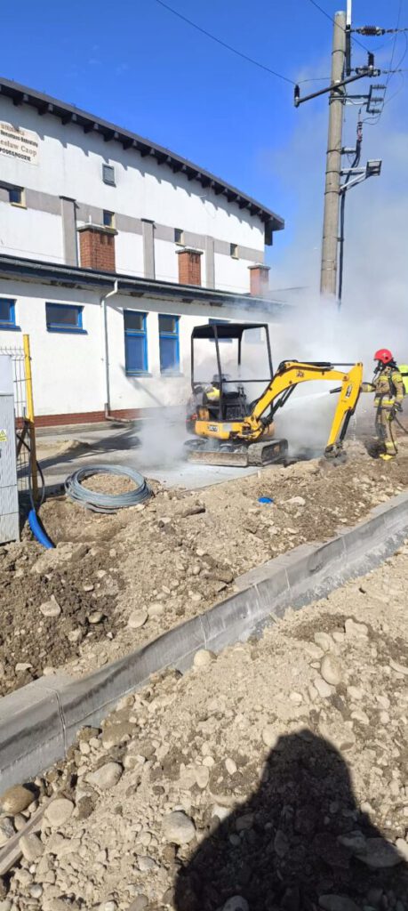 Po przybyciu na miejsce zdarzenia ustalono, że  paliła się minikoparka JCB -relacjonuje rzecznik PSP Nowy Sącz – Pożar rozwijał się w pobliżu transformatora oraz sieci energetycznej. Właściciel podjął nieskuteczną próbę ugaszenia pożaru za pomocą gaśnicy proszkowej. Działania zastępów straży pożarnej polegały na zabezpieczeniu miejsca zdarzenia oraz  podaniu jednego prądu piany ciężkiej na paląca się maszynę budowlaną. Po ugaszeniu sprawdzono kamerą termowizyjną spaloną koparkę. Na miejsce przybyło Pogotowie Energetyczne, które nie stwierdziło uszkodzenia urządzeń energetycznych. Na tym działania zakończono.