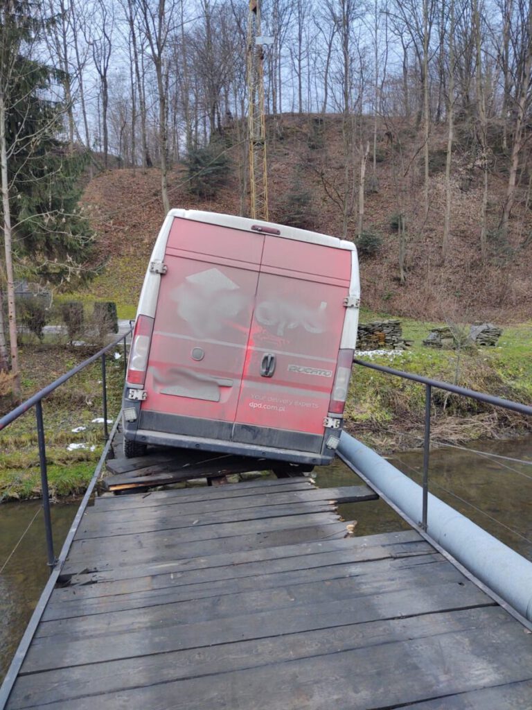 –Po przybyciu na miejsce zdarzenia stwierdzono, że pod samochodem dostawczym firmy kurierskiej załamały się drewniane belki na moście co spowodowało, że pojazd przechylił się i zawisł na stalowej konstrukcji mostu -relacjonują strażacy – Most prowadzi do jednego domu nad rzeką Kamionka. Samochodem dostawczym podróżował sam kierujący, który opuścił pojazd przed przybyciem zastępów straży pożarnej. Kierujący nie uskarżał się na żadne dolegliwości.
