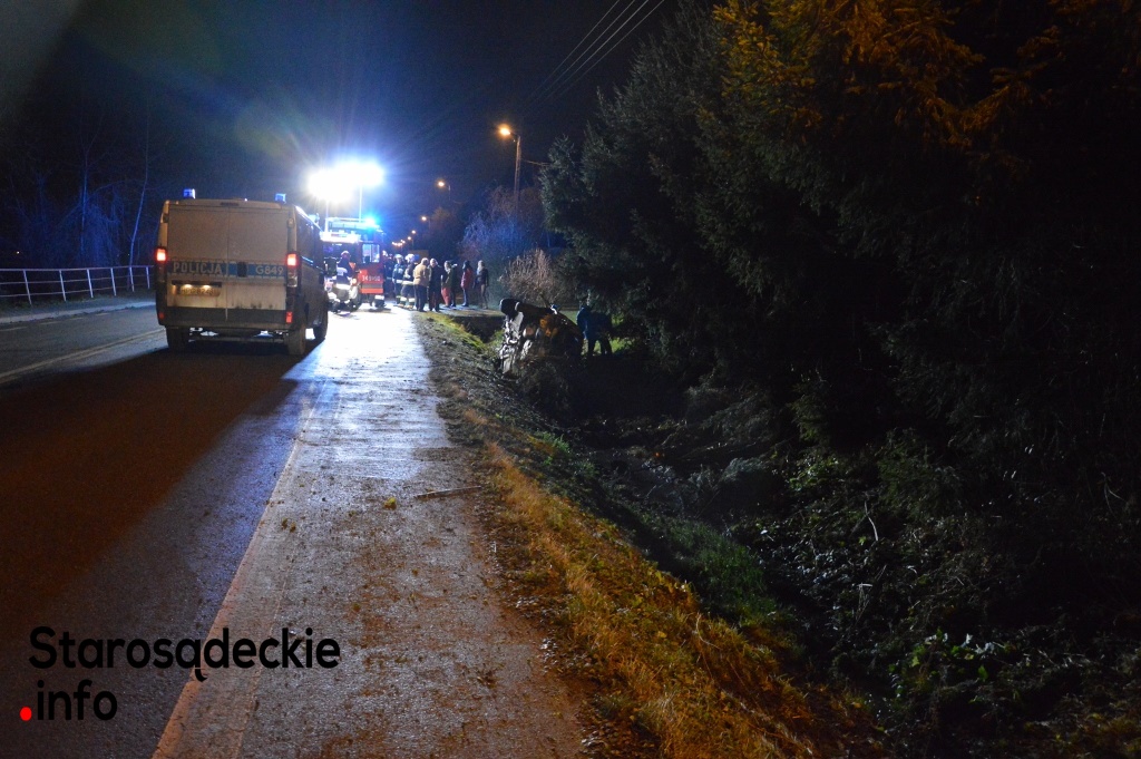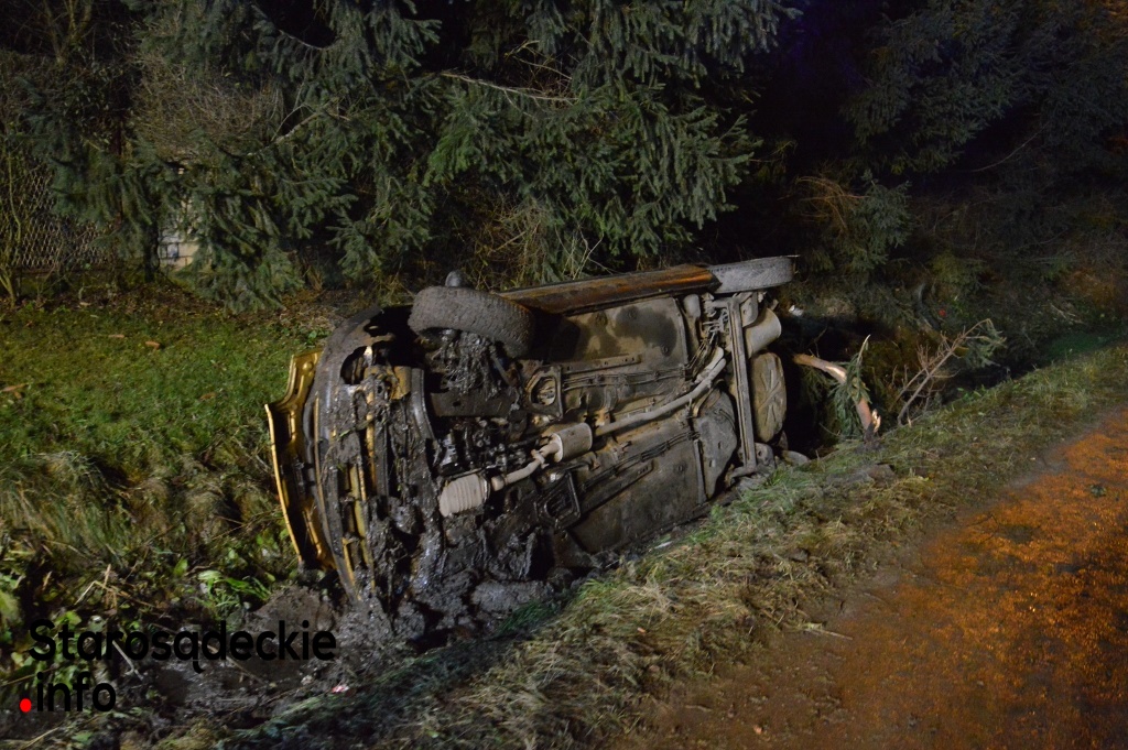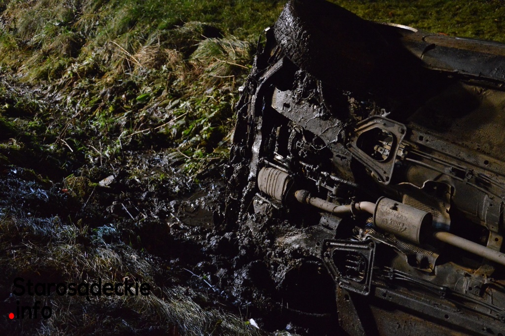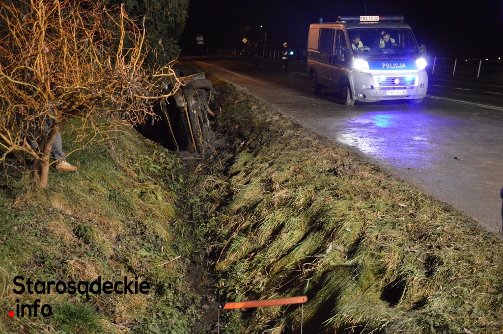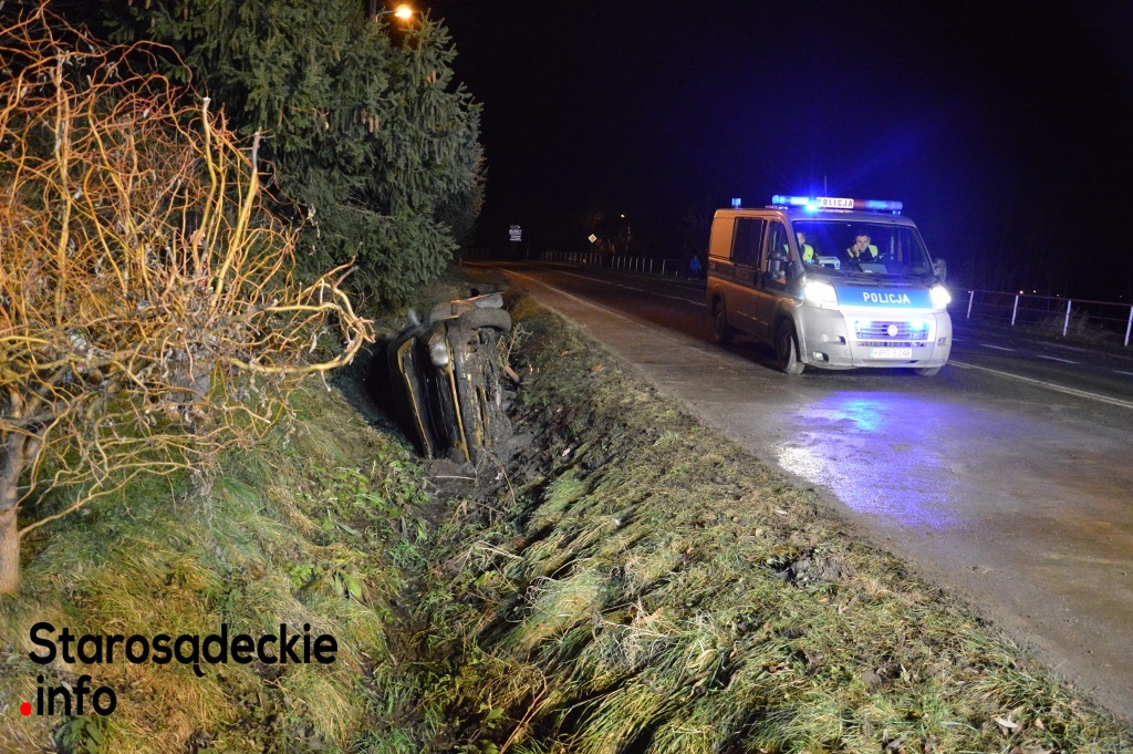 –Kierowca nie dostosował prędkości do warunków panujących na drodze. Na łuku jezdni stracił panowanie nad kierownicą, dachował i zatrzymał się w przydrożnym rowie. Dwie osoby -pasażerowie -pozostały przetransportowane do sądeckiego szpitala. Czekamy na informację nt. obrażeń -powiedział na miejscu funkcjonariusz policji.