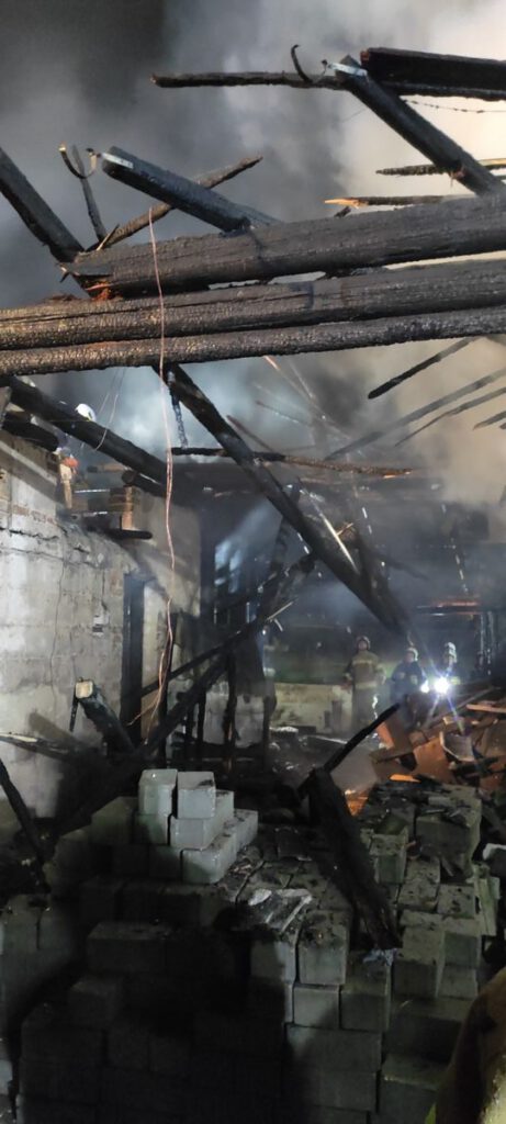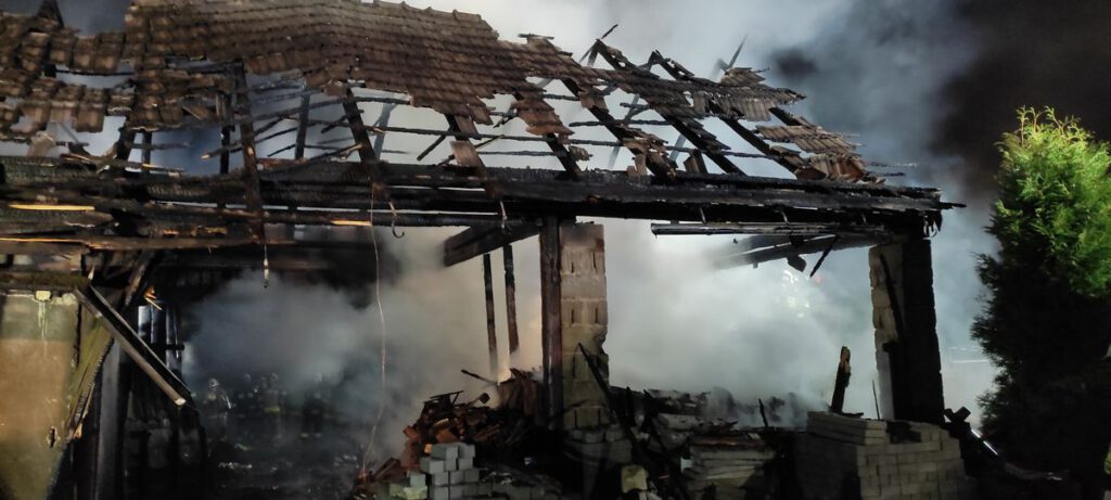 Palił się budynek gospodarczy, który po przyjeździe strażaków w całości objęty był ogniem -relacjonują strażacy –Zagrożone były dwa budynki mieszkalne oraz garaż. Prąd w budynku został odłączony przez właściciela. Wszystkie osoby zamieszkujące w pobliżu pożaru nie uskarżały się na żadne dolegliwości. Po stłumieniu płomieni ściągnięto dachówki przy pomocy bosaka. Po tej czynności przystąpiono do ugaszenia palącej się konstrukcji dachu a następnie przy pomocy pilarek do cięcia drewna rozebrano konstrukcje dachu. Nadpalone belki usuwano w bezpieczne miejsce oraz przelewano je wodą. Na miejsce dotarła mini koparka, przy pomocy której sukcesywnie usuwano ze środka słomę, która była dogaszana.