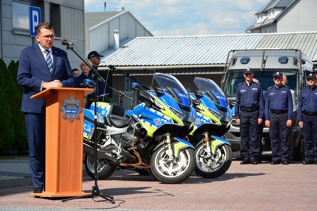 Następnie głos zabrał Wojewoda Małopolski, Łukasz Kmita. – Inwestowanie w bezpieczeństwo Polaków to, jak wielokrotnie podkreślał premier Mateusz Morawiecki, jedno z najważniejszych zadań rządu. Ma ono swój realny wymiar chociażby w kolejnych ustawach modernizacyjnych, ale także w postaci powiększania kadr służb mundurowych. Nowe etaty, które pozwalają zasilić Oddział Prewencji Policji, stanowią dodatkowe zabezpieczenie zarówno dla mieszkańców Małopolski, jak i przebywających w naszym regionie gości – mówił wojewoda. – Małopolska jest regionem wyjątkowym ze względu na atrakcyjność turystyczną. Zarówno w okresie letnim, jak i zimowym, ruch turystyczny generuje dodatkowe wyzwania związane z zabezpieczeniem chociażby imprez masowych. Co więcej, Sądecczyzna to obszar bogaty w miejscowości uzdrowiskowe, które podejmują kuracjuszy przez cały rok. Nie bez znaczenia pozostaje także fakt, że obszar ten graniczy z naszym słowackim sąsiadem. Umiejscowienie właśnie w Nowym Sączu sił Oddziału Prewencji Policji ma więc charakter strategiczny – dodał Łukasz Kmita. – Wszyscy mamy świadomość, jak cenny jest czas dotarcia na miejsce interwencji. Jest on jednym z tych czynników, które wpływają na skuteczność podejmowanych działań. Mobilność nowo tworzonej kompanii Oddziału Prewencji Policji z siedzibą w Nowym Sączu stanowi jej dodatkową wartość. Jestem przekonany, że służba na tym obszarze będzie powodem osobistej satysfakcji i dobrego rozwoju zawodowego dla wszystkich, którzy zasilą szeregi kompanii – zakończył wojewoda Łukasz Kmita.