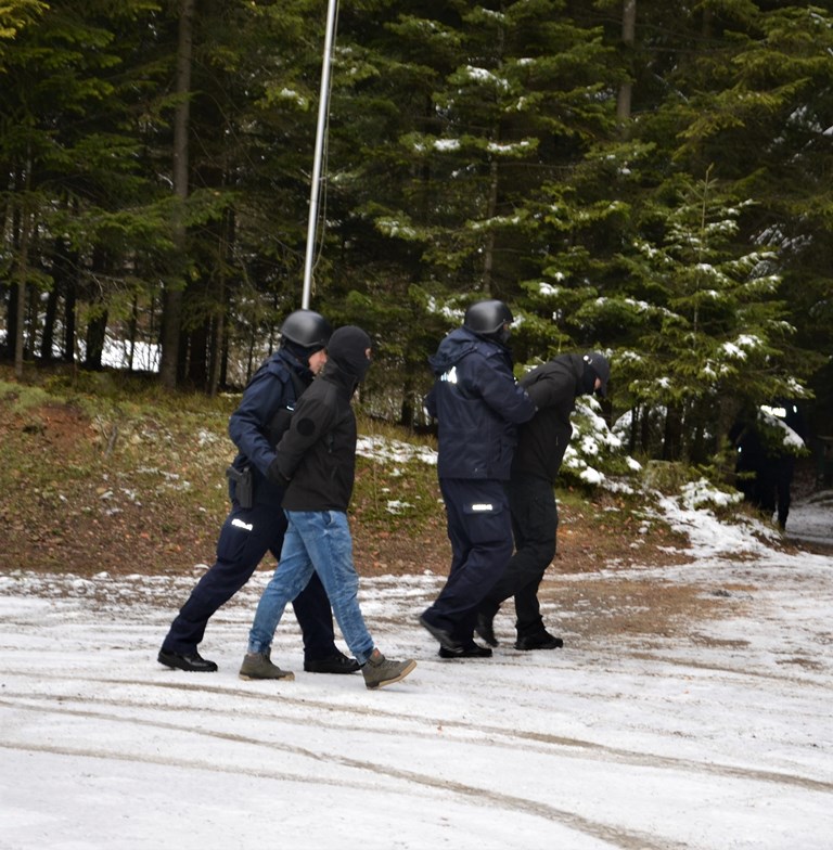 W czwartek 24 listopada br. na terenie Nowego Sącza i powiatu nowosądeckiego przeprowadzono ćwiczenia, których celem było sprawdzenie w praktyce prowadzenia policyjnych działań pościgowych. Scenariusz zakładał, że policjanci otrzymali informację o napadzie na sklep jubilerski w Nowym Sączu. Według zgłoszenia dwóch zamaskowanych mężczyzn sterroryzowało ekspedientkę, zabrało gotówkę i biżuterię, po czym zbiegli z miejsca zdarzenia, a następnie wsiedli do zaparkowanego nieopodal samochodu. Oficer dyżurny sądeckiej jednostki natychmiast skierował funkcjonariuszy we wskazany rejon, ponadto podjęte zostały także działania pościgowe w celu zatrzymania sprawców tego przestępstwa. Na głównych drogach w kilku miejscowościach Sądecczyzny zostały rozstawione posterunki blokadowe, a z uzyskanych później informacji wynikało, że sprawcy poruszają się w stronę Krynicy-Zdroju. Tam ich samochód pokonał blokadę i kontynuował ucieczkę w kierunku w Tylicza, gdzie sprawcy porzucili pojazd i pieszo oddalili się do lasu. Skierowani na miejsce funkcjonariusze Nieetatowych Pododdziałów Prewencji prowadzili poszukiwania w terenie, których efektem było zatrzymanie dwóch mężczyzn podejrzewanych o dokonanie napadu na sklep jubilerski.