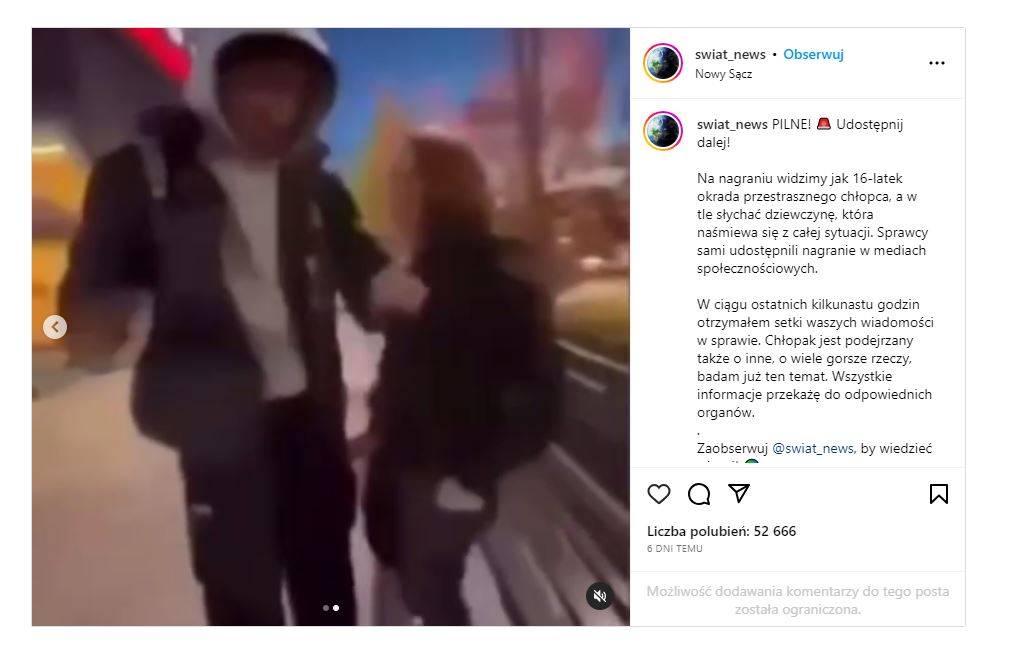 13 listopada br. około godziny 16:00 w pobliżu jednej z galerii handlowych w Nowym Sączu 16-latek zaczepił przechodzącego obok budynku 14-letniego chłopca i zażądał pieniędzy. Przyparł go do ławki, a kiedy znalazł w jego odzieży portfel, wyciągnął z niego pieniądze. Całą sytuację nagrała koleżanka 16-latka, która widząc, co robi chłopak, nie zareagowała, a wręcz była tym rozbawiona.