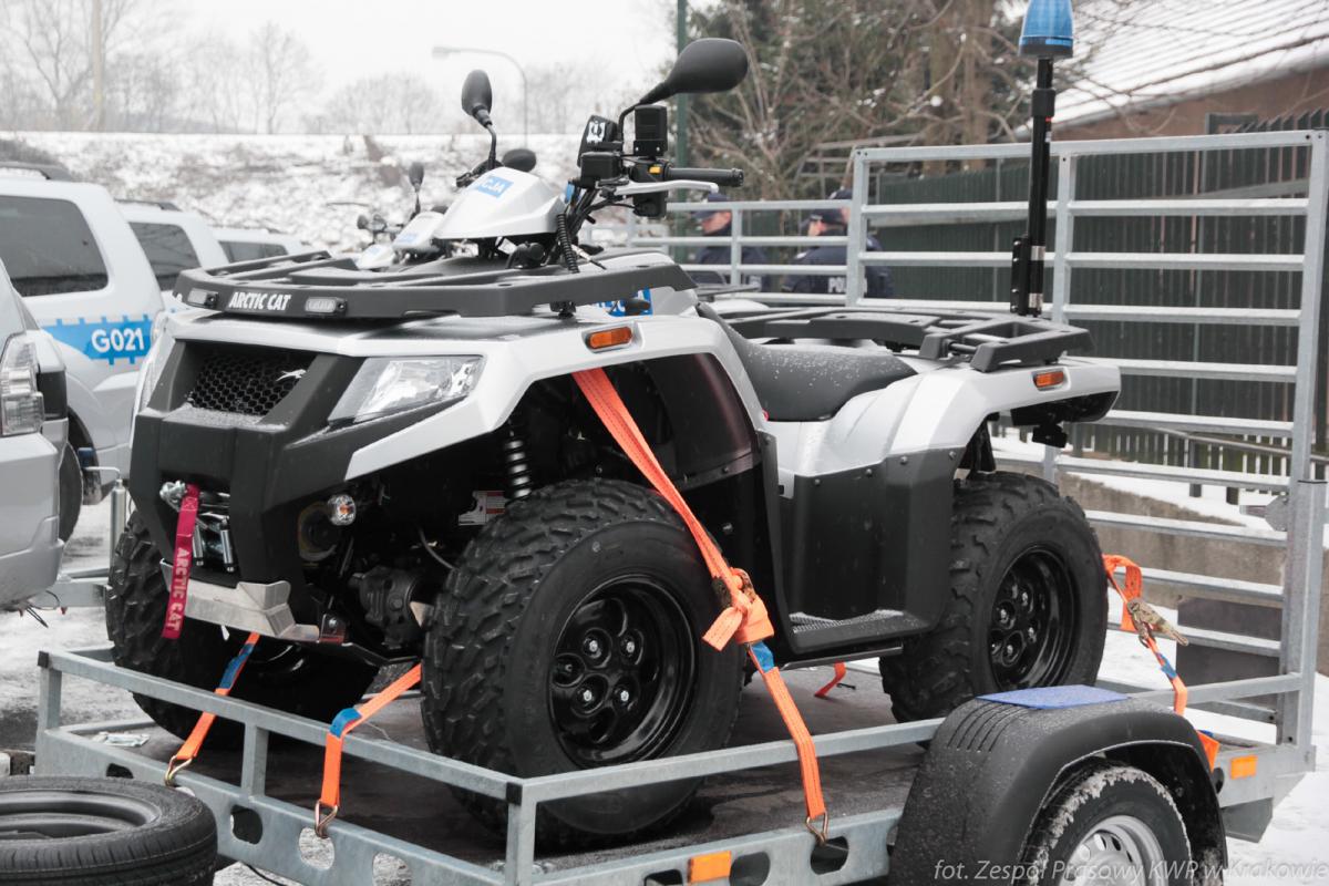 Komenda Wojewódzka Policji w Krakowie zakupiła 6 zestawów samochodowych w skład których wchodzą – samochody osobowo-terenowe m. Mitsubishi Pajero oraz 6 quadów z przyczepami transportowymi niezbędnych do prowadzenia patroli i działań poszukiwawczo-ratunkowych na obszarze województwa małopolskiego. Pojazdy zostały zakupione przy dofinansowaniu z Małopolskiego Regionalnego Programu Operacyjnego na lata 2007-2013, oś 6. Spójność wewnątrzregionalna, Działanie 6.3 Poprawa bezpieczeństwa mieszkańców, w tym socjalnego i zdrowotnego, schemat C. Służby Ratunkowe z Europejskiego Funduszu Rozwoju Regionalnego. Dofinansowanie z MROP 2007-2013 wynosiło 1 382 583,75 zł.
