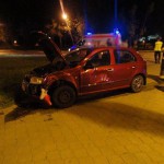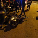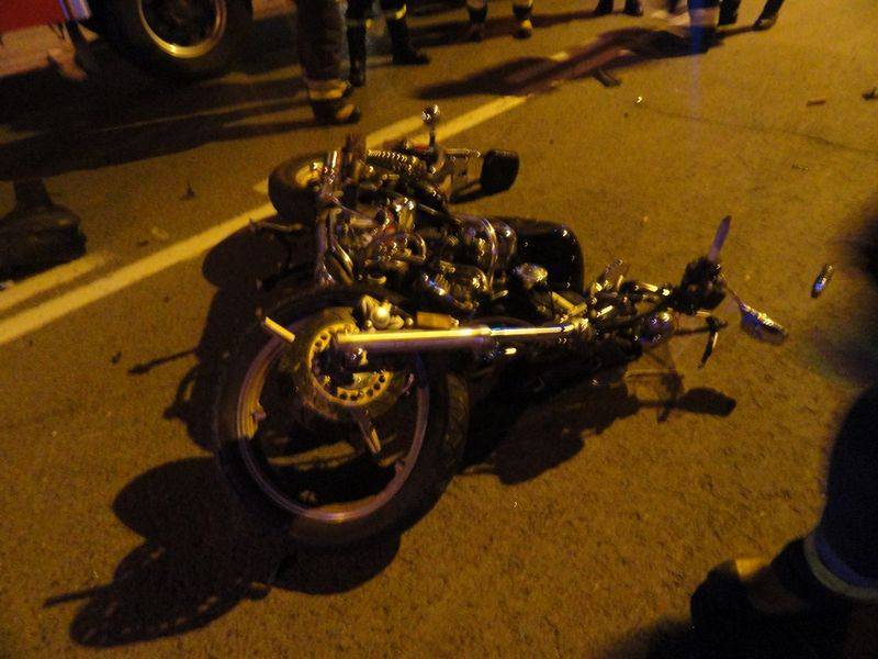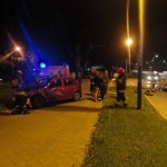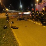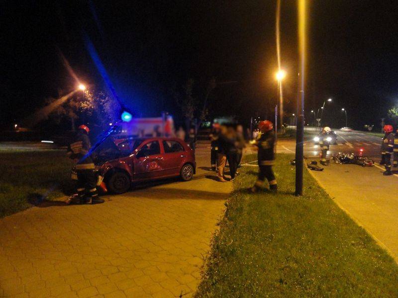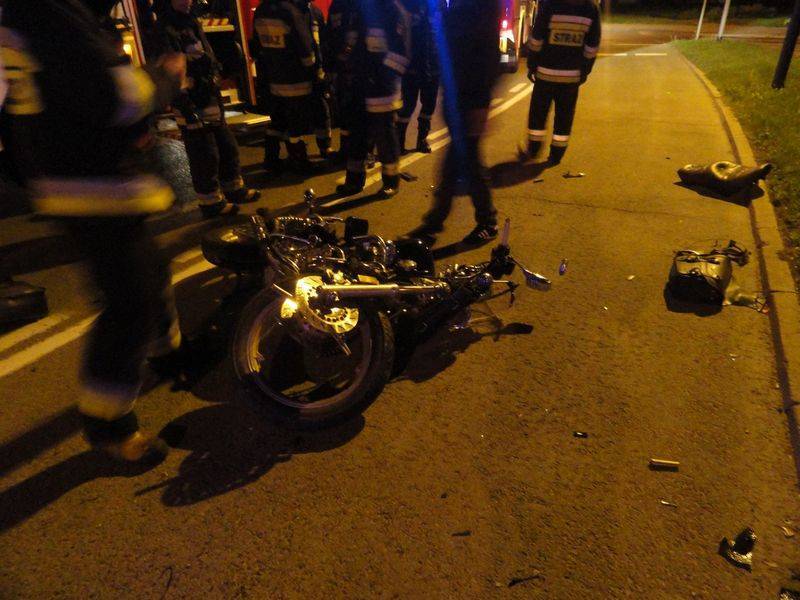 Rozbity motocykl znajdował się na pasie jezdni natomiast samochód osobowy na chodniku między jezdniami. Osoby podróżujące samochodem osobowym nie uskarżały się na żadne dolegliwości. Samochód osobowy zjeżdżając z jezdni uszkodził słupek kierunkowy z nazwami ulic. Działania strażaków polegały na zabezpieczenie miejsca zdarzenia , odłączeniu klem akumulatorów w pojazdach oraz zakręceniu zaworu butli z gazem w samochodzie.